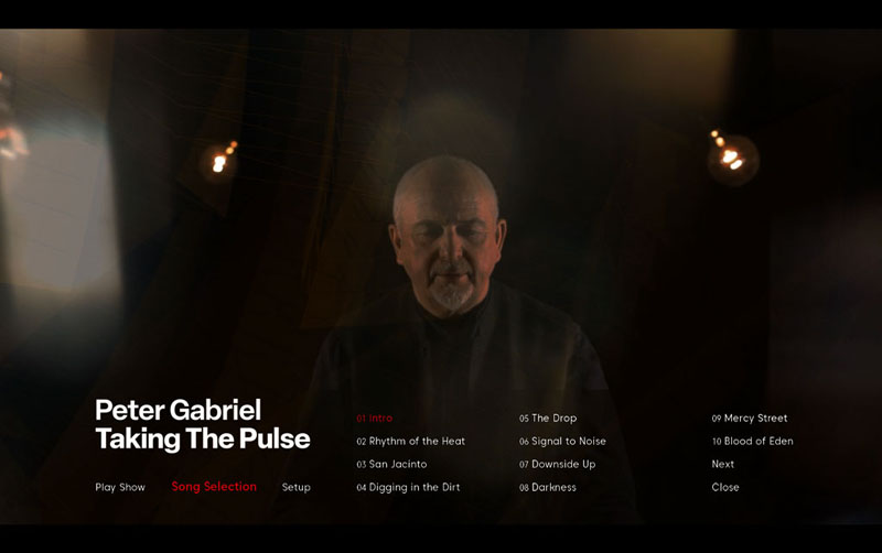 Setlist: 01. Intro 02. Rhythm Of The Heat 03. San Jacinto 04. Digging In The Dirt 05. The Drop 06. Signal To Noise 07. Downside Up 08. Darkness 09. Mercy Street 10. Blood Of Eden 11. Washing Of The Water 12. Intruder 13. Red Rain 14. Solsbury Hill 15. In Your Eyes 16. Don't Give Up 17. The Nest That Sailed The Sky 18. Credits |